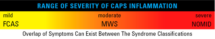 Before the genetic mutation for CAPS was discovered, FCAS, MWS and NOMID/CINCA were considered to be different and unrelated periodic fever syndromes. In the 21st century, genetic mutations in the NLRP3 (CIAS1) gene were found to be present in most patients with these syndromes. Now, these three syndromes are believed to represent varying degrees of chronic inflammation caused by the same condition (CAPS) within the NLRP3 genetic mutation region. If you consider all the syndromes of CAPS as the same disorder, with FCAS at the low end of severity, and NOMID/CINCA at the high end, Muckle-Wells falls in the middle region on this disease spectrum. Many patients have overlapping symptoms along the CAPS inflammation spectrum between each classification of FCAS, MWS and NOMID. It is important to look at the classic findings for each of these forms of CAPS to understand how these syndromes are very similar, yet unique.